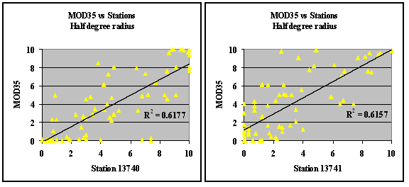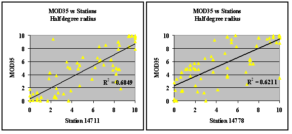 Table 1. Current Sources of Cloud Data for the Chesapeake Bay Watershed In order to compare CBP and MOD35 datasets, a decision had to be made on how to correspond meteo-station cloud observations with a ground observer’s field-of-view (FOV). Discussions with CBP, as well as varying kernel-size tests, suggested that the collection of MOD35 data for an area within a half degree radius from the location of the meteo-station would provide a good representation of the ground observer’s FOV. As a result, each MOD35 dataset was subsetted to the area within a ½ degree radius of each station and percent cloud cover for each area was calculated for the cases when MOD35 data covered between 50% and 100% of the area. MOD35 data for a given station was excluded from the analysis if less than 50% of the area was covered. Next, all measurements for a given station, given day were averaged to acquire a daily percent cloud cover value. Finally, MOD35-based daily cloud cover scores were compared to corresponding ground observations. This provided direct validation data to ensure that the processed MOD35 data agrees with the existing cloud information. A rather significant - 50 to 70 percent - correlation between cloud station and MOD35 values was identified (Figure 3). The results suggest that MODIS is a good (and more spatially coherent) substitute to the meteo-station cloud observations. Also, it can be expected that with the future introduction of MYD35 cloud data from Aqua for 2002+ time period (in addition to the MOD35 data stream from Terra), the increase in the number of daily observations will further increase the quality of cloud cover assessments.