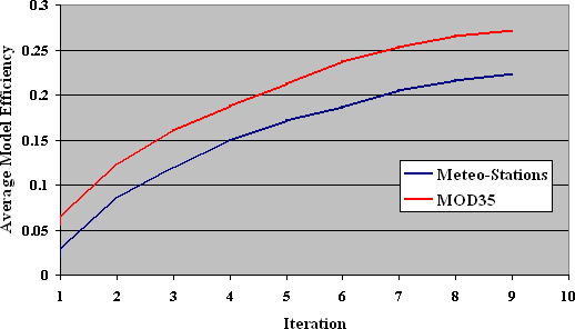 Table 2. Overall Improvement in Model Efficiency Figure 4 illustrates the overall improvement in model efficiency during the iterative calibration process. At each iteration, average model efficiency was higher with MOD35 data. Overall, CBP is pleased with the introduction of MODIS cloud cover and is anxious for other inputs, such as precipitation. For CBP's current Phase 4.3 WSM, cloud cover data is used for the 1/1/1984 through 12/31/2000 time period. As CBP is currently transitioning to the use of the new Phase 5 model, which will extend the model simulations out to 2004, they plan on using MODIS cloud cover data delivered by GDA for all input data from 2001 to 2004.